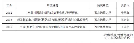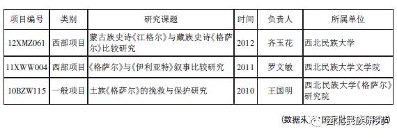2. 史诗比较研究,尤其是经久不息的蒙藏《格萨尔》比较研究及传统的中印、中欧史诗比较研究。近年来国内还由西北民族大学领衔开展了土族、裕固族等《格萨尔》史诗的比较研究。这一主题在立项课题中热潮暂退,只检索到社科基金项目3 项,教育部项目3 项,全部由西北民族大学学者主持。