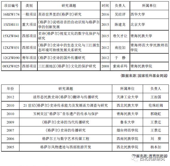 1. 史诗的基础研究及资料整理。侧重点是基于人类学或民族志研究方法,普查各类田野研究中《格萨尔》的艺人、版本问题,进行文库建设并在后期扩展为数据库建设。这一类研究成为《格萨尔》研究的主体,其中社科基金项目20 项,教育部项目9 项,占到了项目总数的近一半。由于信息技术的发展,数据库建设成为各种传统学科转型的新热门,然而深究之,仍属于基础性的资料研究范畴,故均列入此类别下。