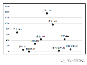 其三,与社会现实有关的话题成为当下的研究热点,这当然与人类非遗代表作名录的申报和获批以及国家非遗倡议与政策相关。与保护相关的文献就多达444 篇,与遗产相关的文献更多达535 篇。在从具体行业出发讨论《格萨尔》的文章中,较成气候的旅游业占到272 篇,而人们关注较多的影视、动漫、创新、创意等主题均各不超过50 篇。这些相关的文献属于更大范畴的文化研究或者文化产业、文化政策研究,具有更明显的短板,与本文主题较远,不拟在此赘述。