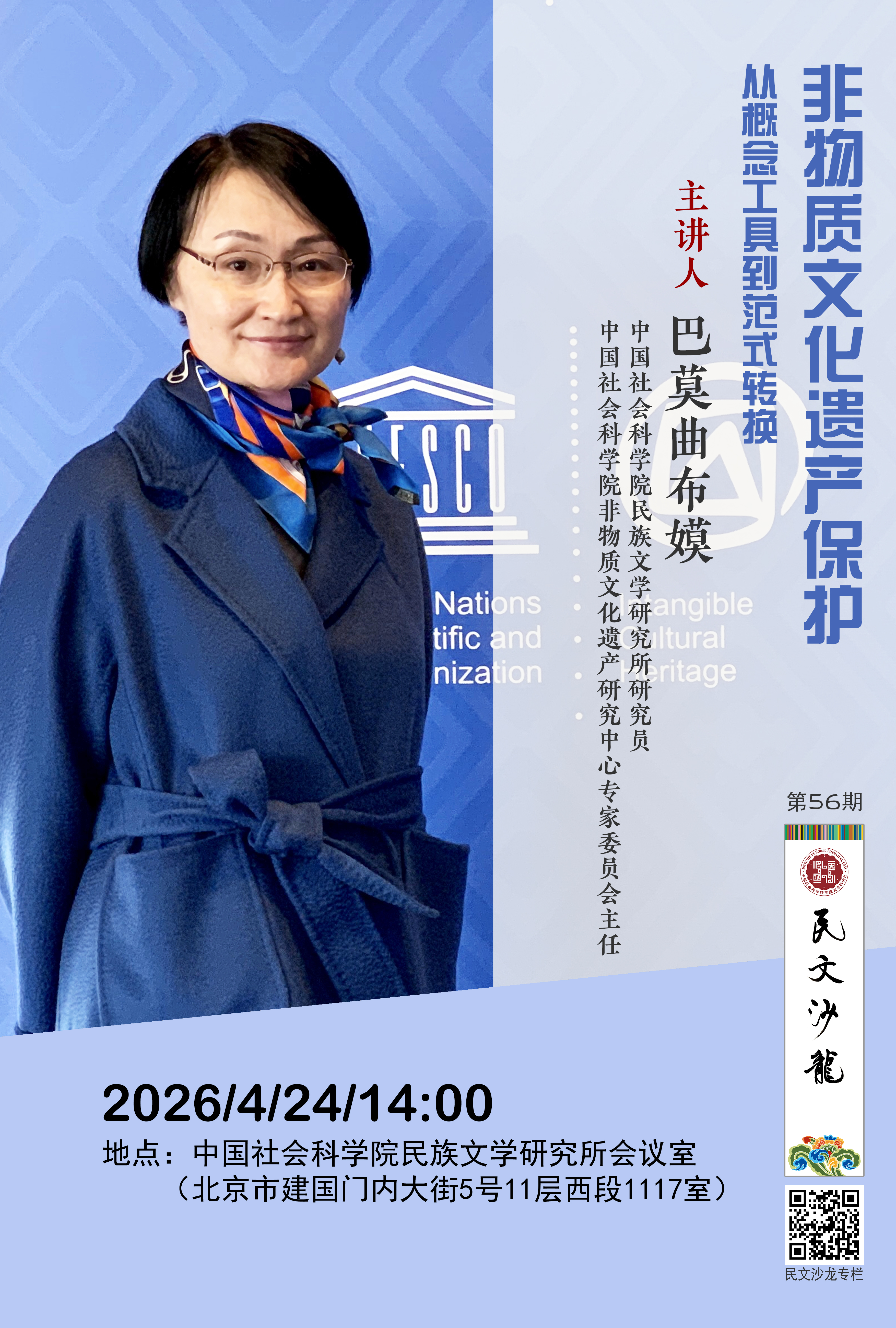 题目:非物质文化遗产保护——从概念工具到范式转换 主讲人:巴莫曲布嫫(中国社会科学院民族文学研究所研究员、中国社会科学院非物质文化遗产研究中心专家委员会主任) 时间:2026年4月24日(周五)14:00 地点:中国社会科学院民族文学研究所会议室(北京市建国门内大街5号11层西段1117室)
